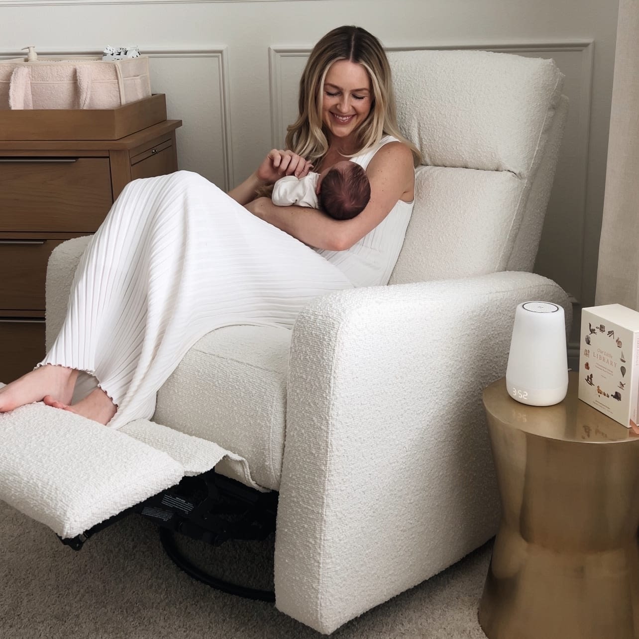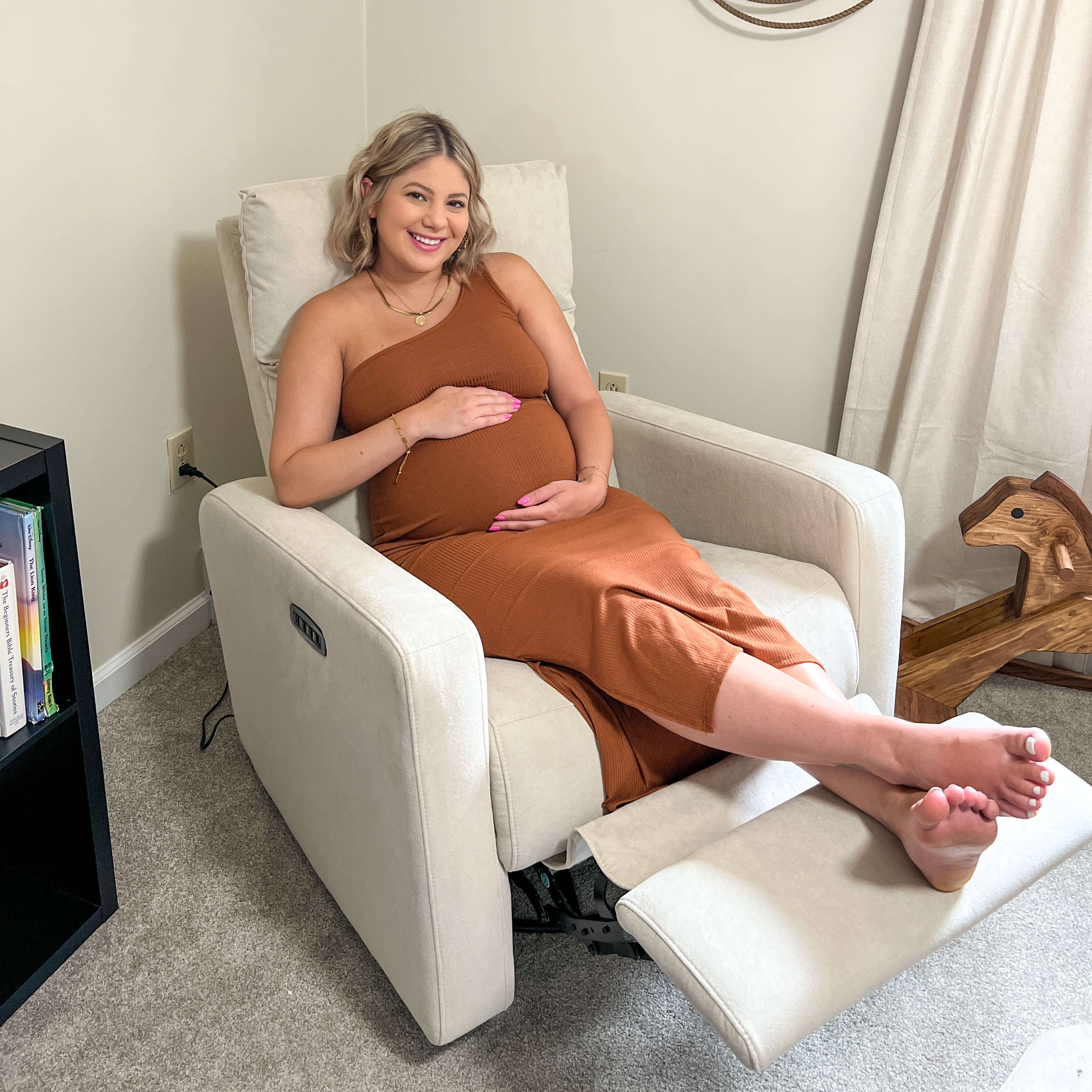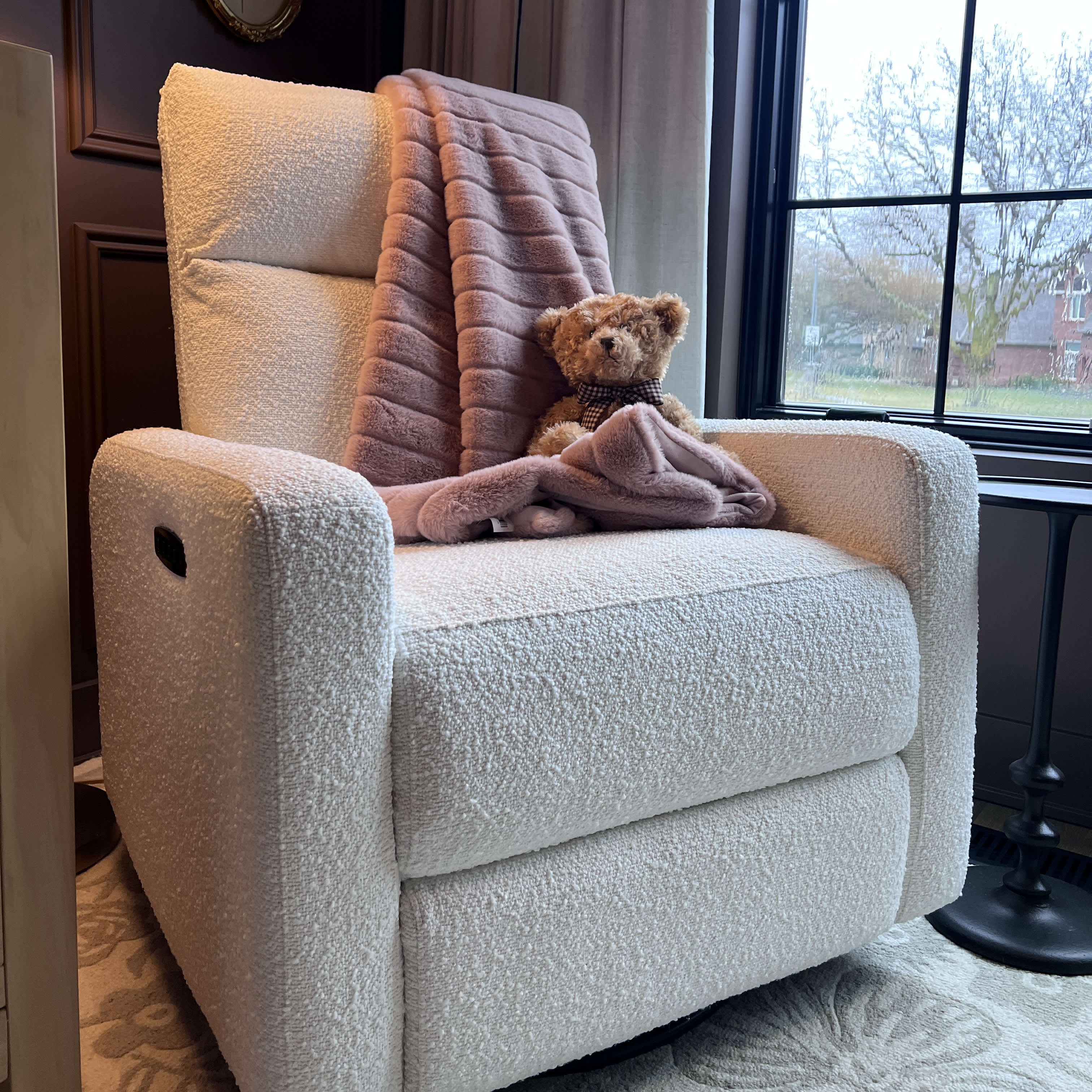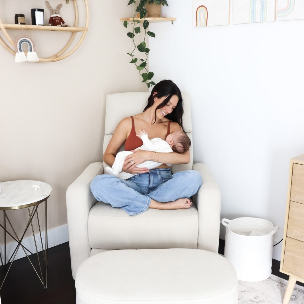 Standard rockers force your lower back to compensate for weakened core muscles after childbirth, causing chronic back pain.The Glider Plus features power lumbar support that adjusts automatically to cradle your lower back exactly where you need it, maintaining proper spinal alignment during marathon feeding sessions. No more propping pillows behind your back or shifting positions. Just targeted support that moves with your body.